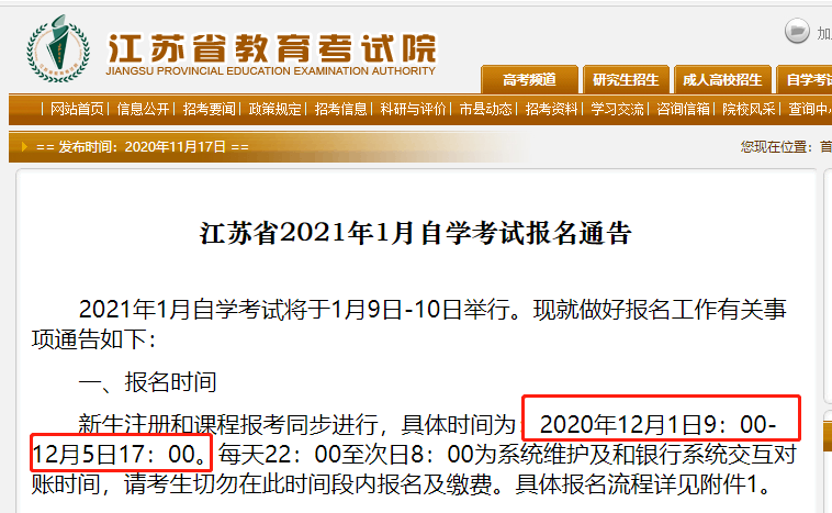 2020年12月1日9:00-12月5日17:00。每天22:00至次日8:00为系统维护及和银行系统交互对账时间,请考生切勿在此时间段内报名及缴费。具体报名流程详见附件1。